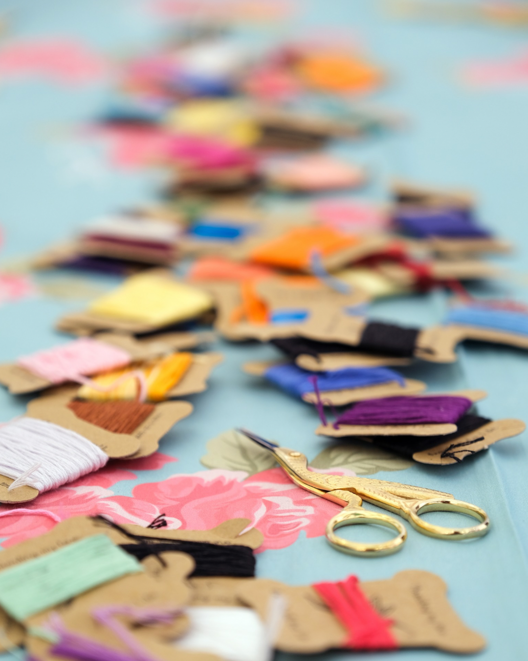 A photo of some of our thread on one of our tablecloths as a workshop with gold embroidery thread scissors in the shape of a stork bird.