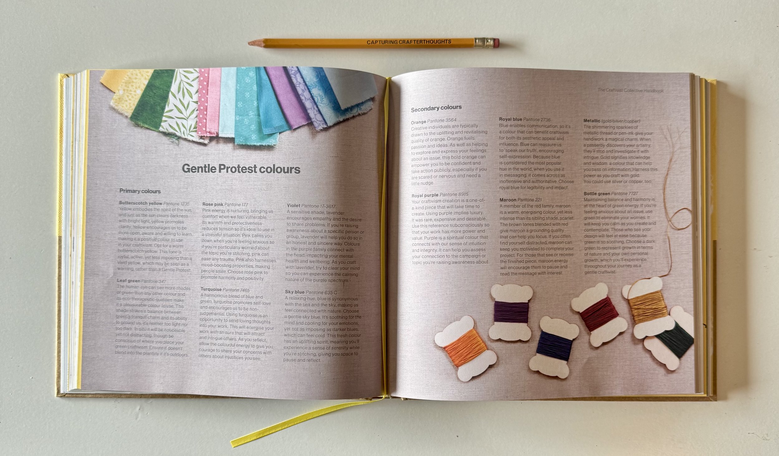 We have created a Gentle Protest colour palette with colour expert Momtaz Begum-Hossain in our award-winning book The Craftivist Collective Handbook (2025) to help gentle craftivists engage deeply in the process, and to attract powerholders to engage with the cause with open minds and open hearts. Colours can differ between cultures and contexts. Therefore our gentle protest colour pallette is our guideline not a rigid rule.